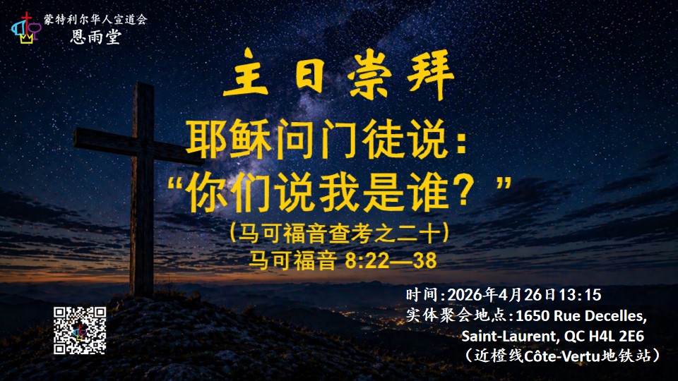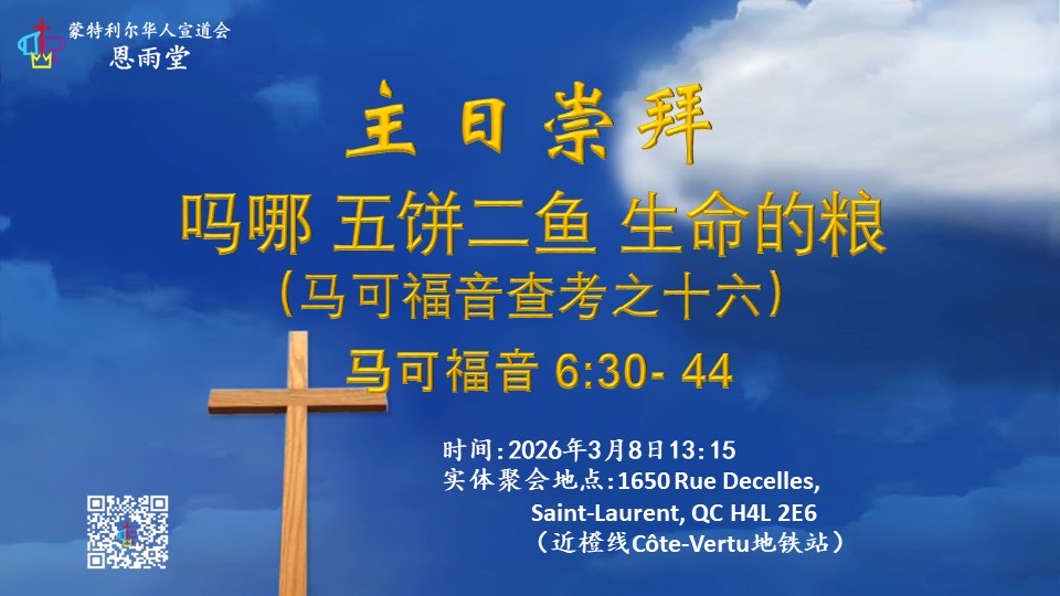 | 周日13:15 | 主日崇拜 | 蔡传道 | 恩雨堂 | 514-5755518 |